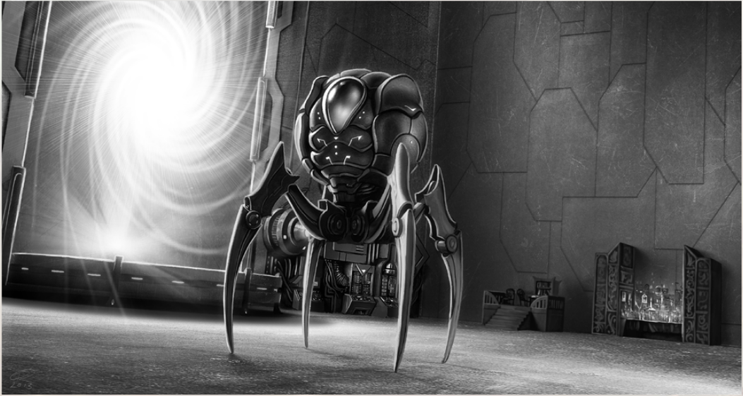 Steel spider base unit has three main sections: input disassembler, eggshell projector, and the control console across the top. Materials which the spiders dump in are reassembled inside the shell to build new spiders, with surplus converted into energy or something almost like spraymetal to recharge and repair existing ones. Console seems to be describing the device's connection to the Eye of the Sea - it's not an essential component, more like a simplified toy model for educational purposes, or possibly a sort of remote control.