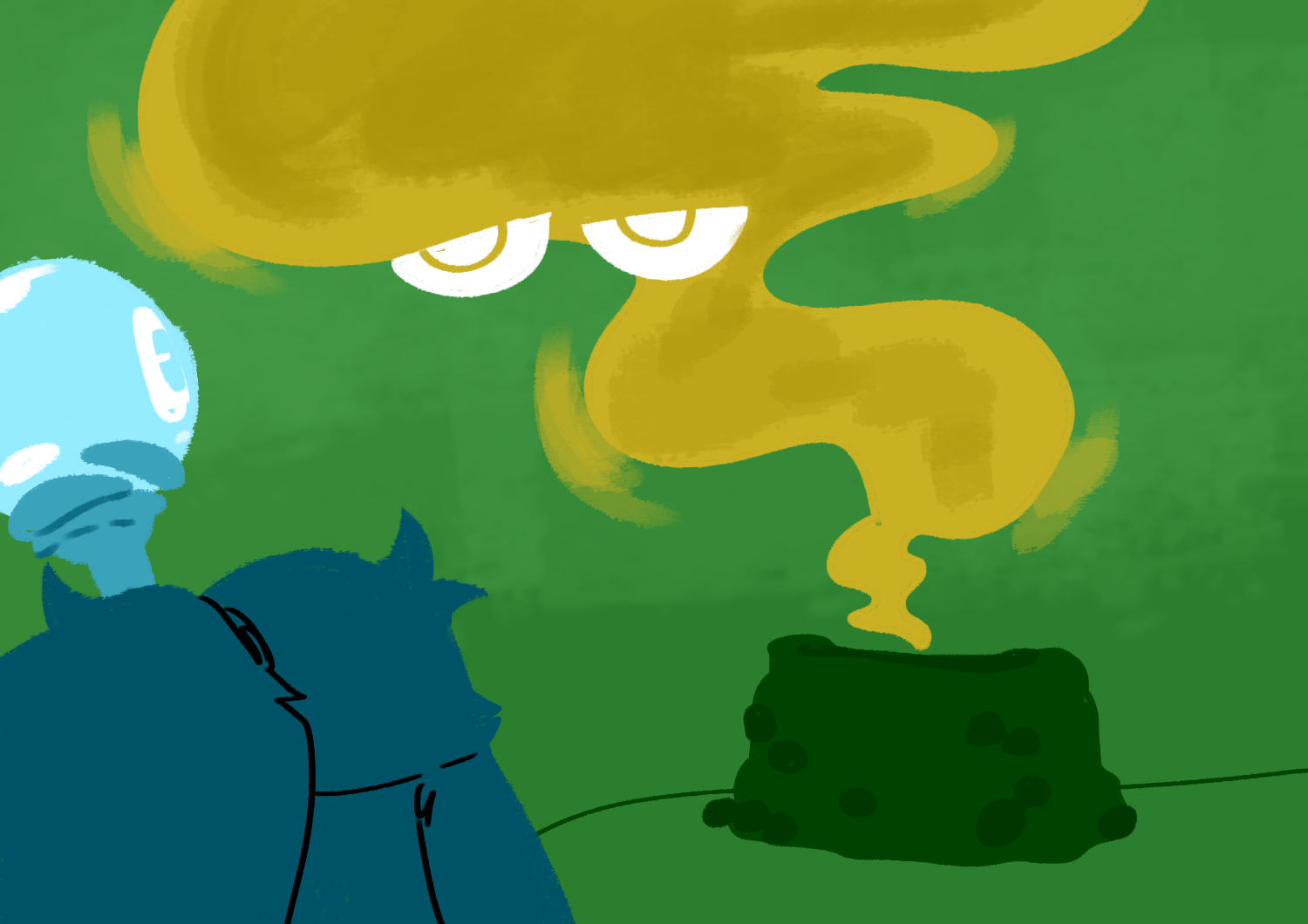 Hezug taps his staff against the ground, the large glass orb on the top lights up