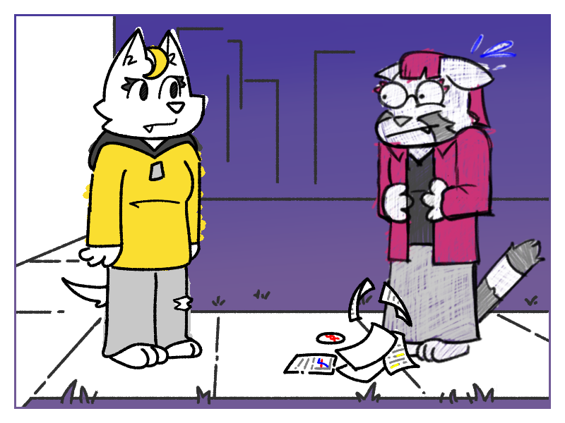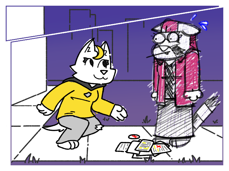 With the strained smile the genet is glued to the pavement and shivering from the freezing wind and anxiety. The smile doesn't last. Both Charlie and Luna stare curiously at the frightened not-kitten. Say something, dang it, she thinks to herself. Soon enough she's shaking, desperate to speak. Her mouth opens, but she remains mute. Her paws clamor awkwardly and her grip on the papers loosens. Say ANYTHING, gods fluffing damn it!