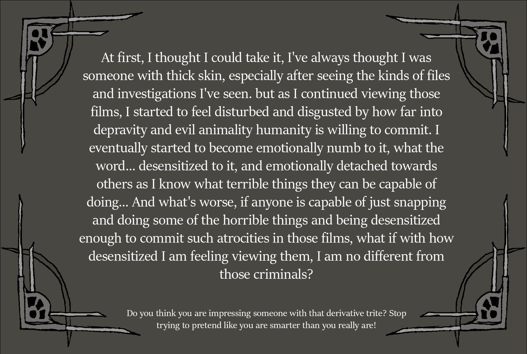 "At first, I thought I could take it, I've always thought I was someone with thick skin, especially after seeing the kinds of files and investigations I've seen. but as I continued viewing those films, I started to feel disturbed and disgust towards how far into depravity and evil animality humanity is willing to commit. I eventually started to become emotionally numb to it, whats the word... desensitized to it, and emotionally detatched towards others as I know what terrible things they can be capable of doing... And what worse, if anyone is capable of just snapping and doing some of the horrible things and be desensitized enough to commit such atrocities in those films, what if with how desensitized I am feeling viewing them, I am no different from those criminals?"
