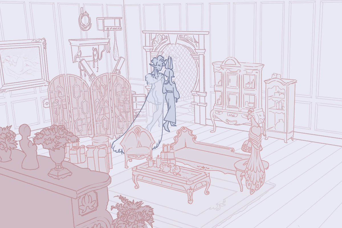 They press the toe of the slipper between Rama's knees, parting them, and then they continue sliding their leg forward until the top of their foot is pressed lightly against Rama's body, settled between his legs. It was already visible that Jupiter is wearing nothing beneath the translucent latex dress, but now Rama can see up beneath the sleek ruffles of the circle skirt.