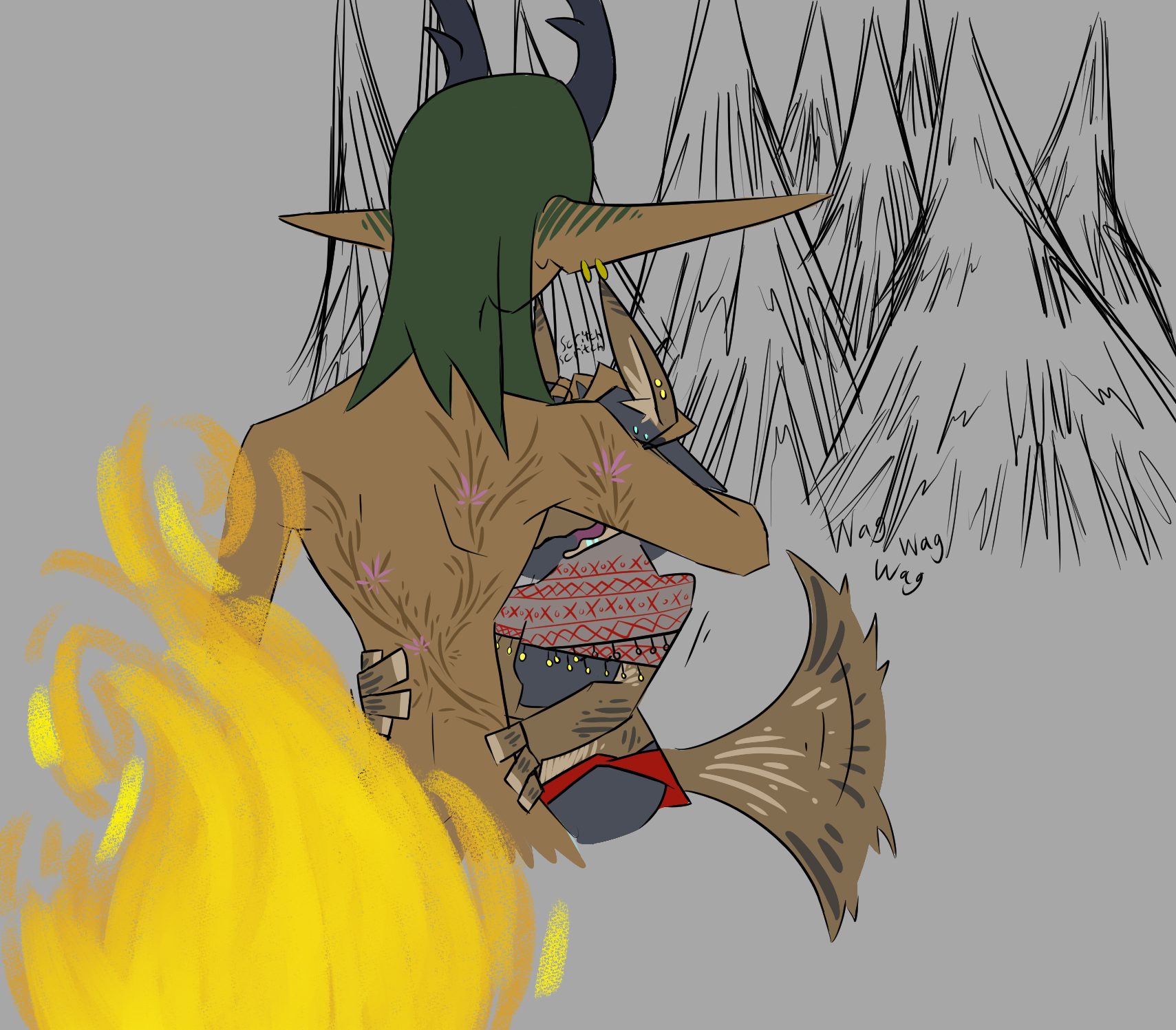 Runi nods, and stares at the pot and the thick tallow on its floor and sides. she thinks about Taalsen. she's very kind, very warm, and apparently very willing to hurt a partner... Runi wonders if she could handle Taalsen, but she knows she wants to try. she catches her paw sliding down her tummy. Runi shivers, realizing that she is very aroused. something about grinding on an elf girl's cock got her worked up. she sets the pot near the fire, to let the tallow heat up, and stands to look around for something to occupy her hands. maybe she should just go out to rub one out before Jess and Dia get back? or maybe she should just distract herself with a chore? or should she maybe try to continue things with Taalsen?