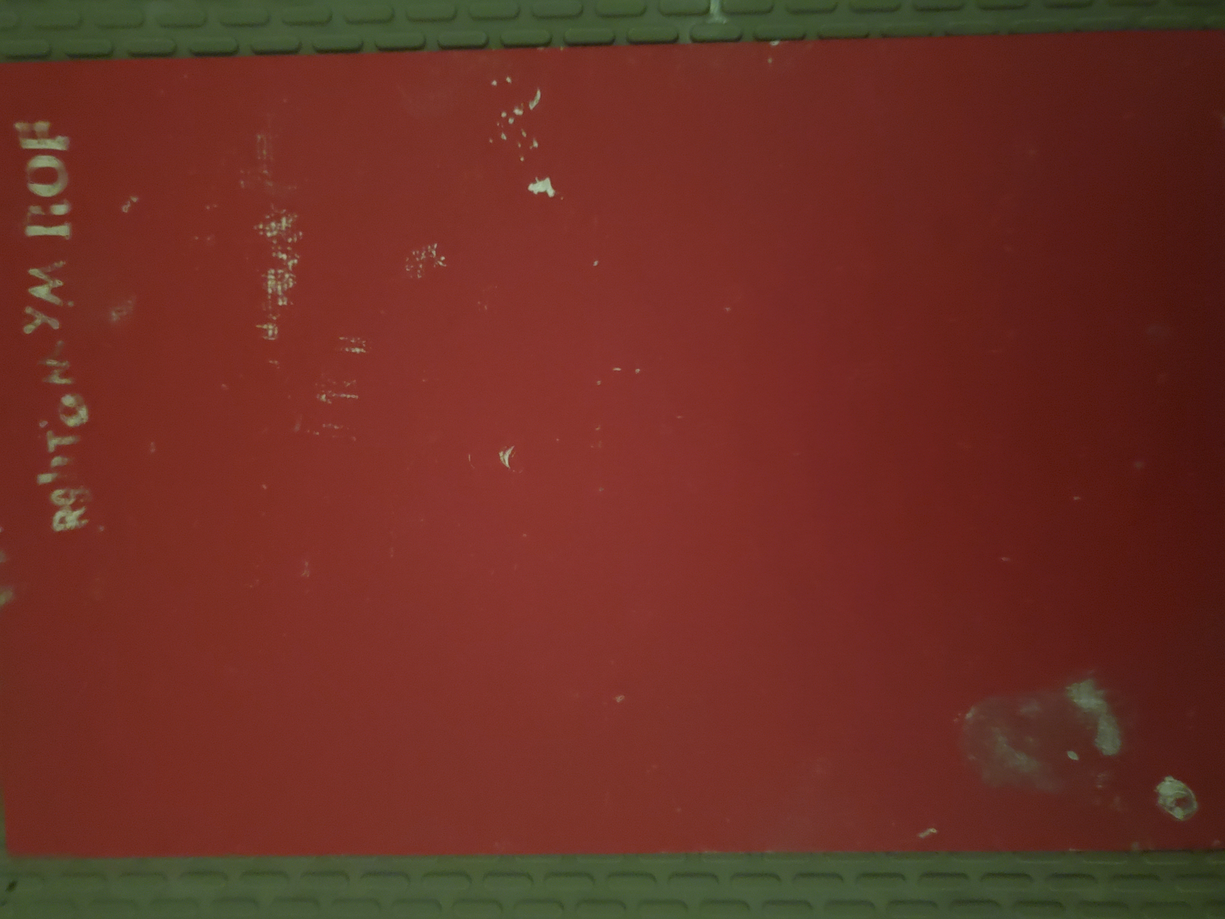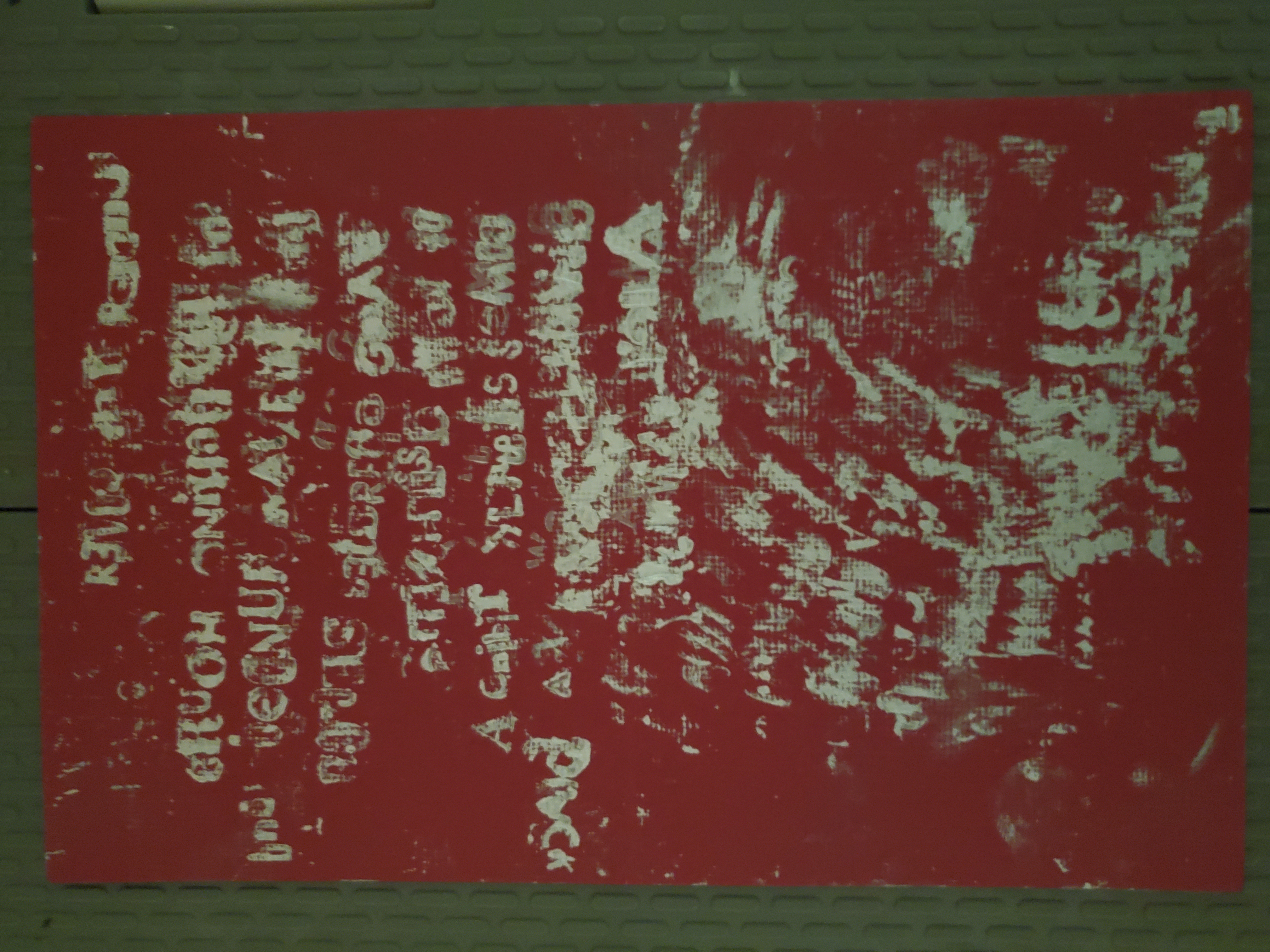 Wow, this is a mess. I'm guessing these are taken by cellphone so the exif orientation is weird... Looks like the text is written backwards, with mixed case and the font even changes. Sometimes letters are upside down or mirrored, and there is inconsistent spacing, with letters overlapping slightly at times. On top of this, the application of paint is messy, with some letters not having enough and others having too much. VERY hard to read.