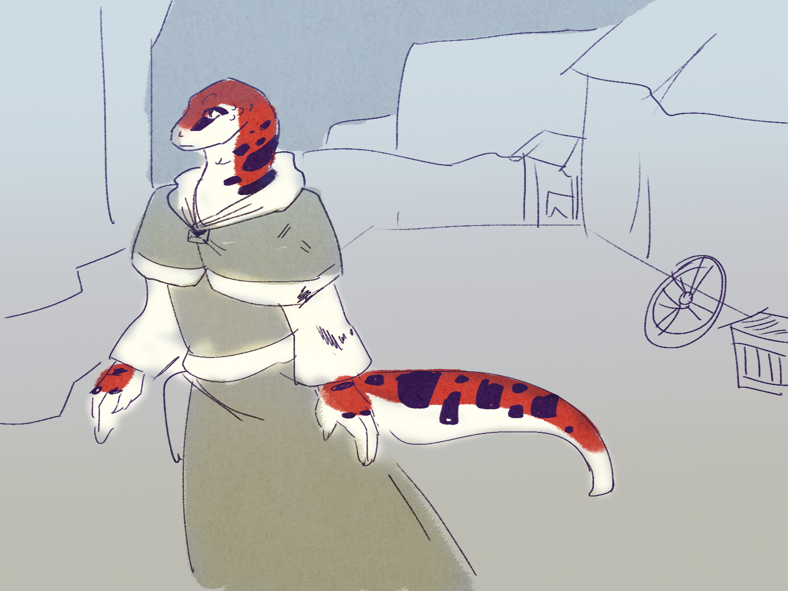 You consider some sort of avian-like form, which would grant you wings, but learning to fly in a body you already aren't used to using would probably cause you to stand out. Eventually, you decide to change shape into that of a lizardfolk: a form like an inferior mockery of your own, but at least it's some comfort to still have scales instead of fragile mammalian skin.