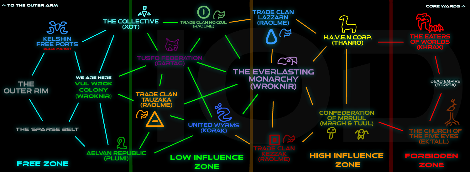 Vul: “While the Ek’tall and Khrax are their main enforcers, it is the Wroknir Monarchy that keeps the peace in the High and Low influence zones.” she points to the middle of the map, “Not only is our kingdom in the center, but it is by far the largest and most powerful of all the old species in this sector. A majority of their fleets here will be mostly Wroknir ships, unless they are sent out for special missions.”