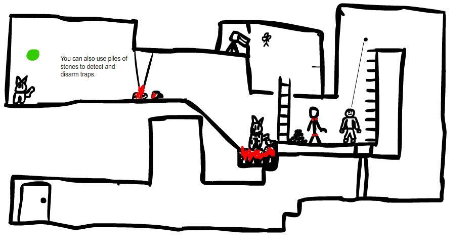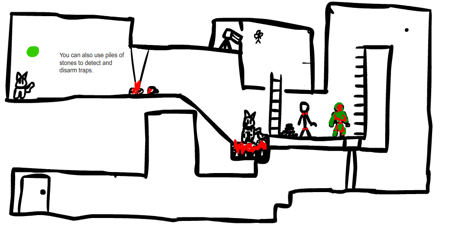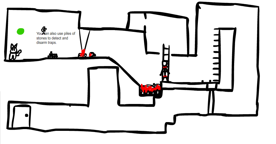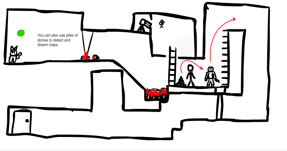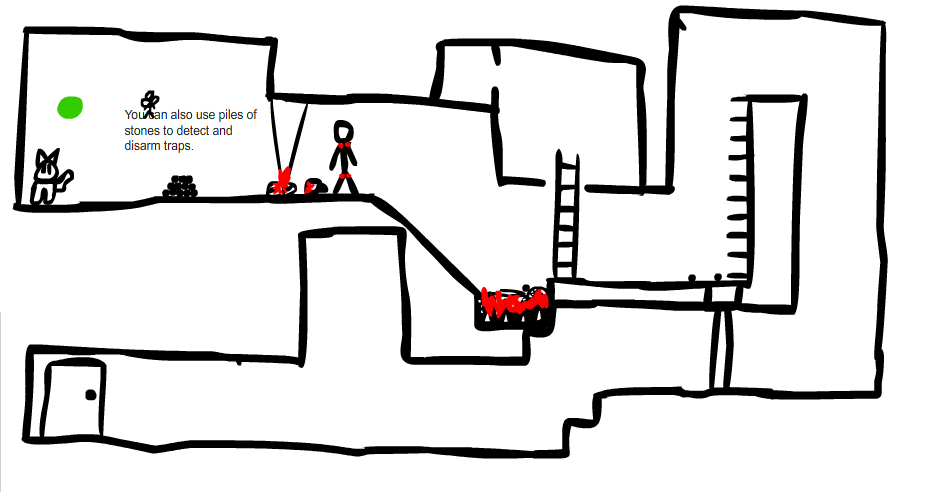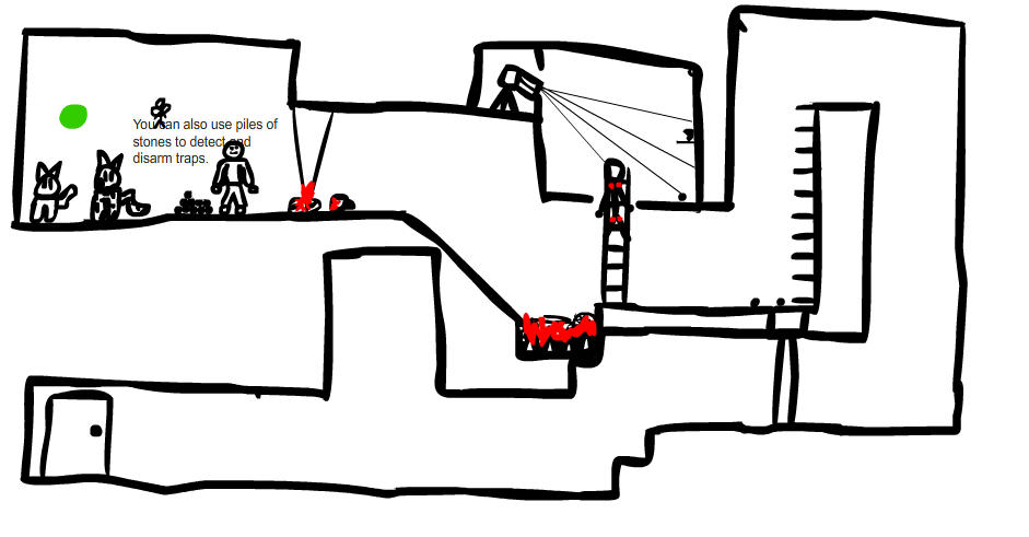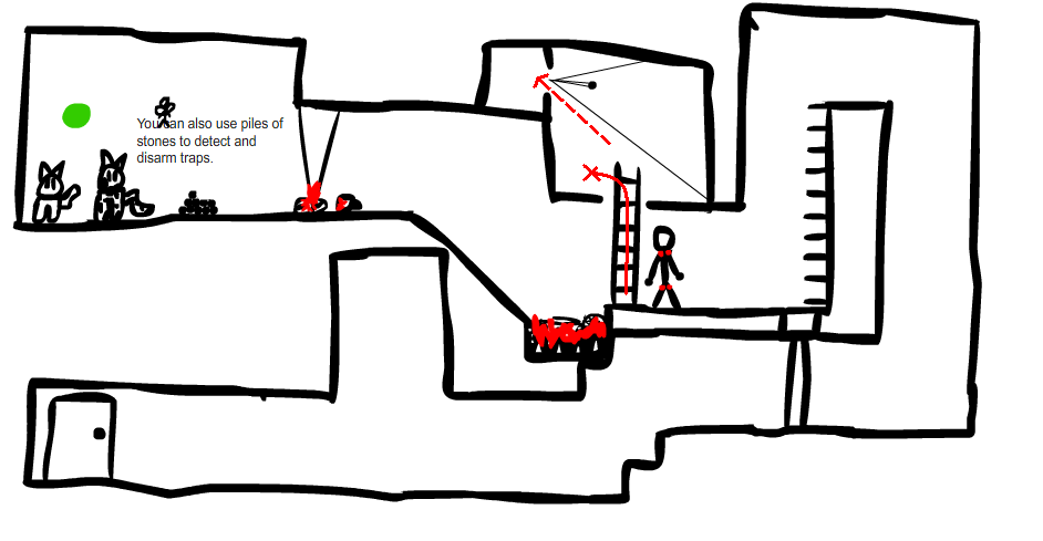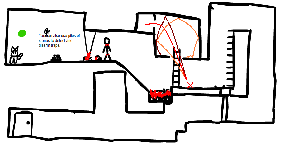 Climb up ladder slowly and roll rock along surface to left. Slide down ladder immediately. If nothing happens, climb back up and retrieve rock. Stand on X, making sure to stay below laser sight lines. Then lean back and lazily throw one rock straight up and immediately throw the other one along the dotted red line, as hard as possible.