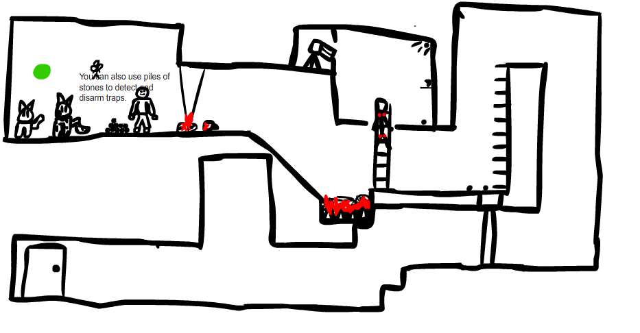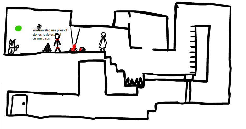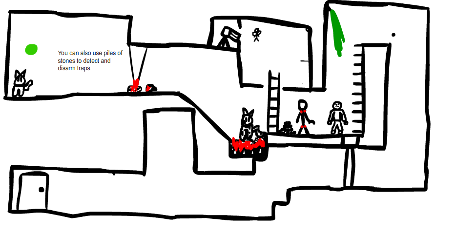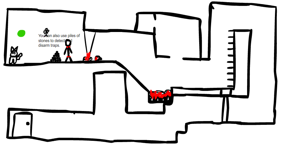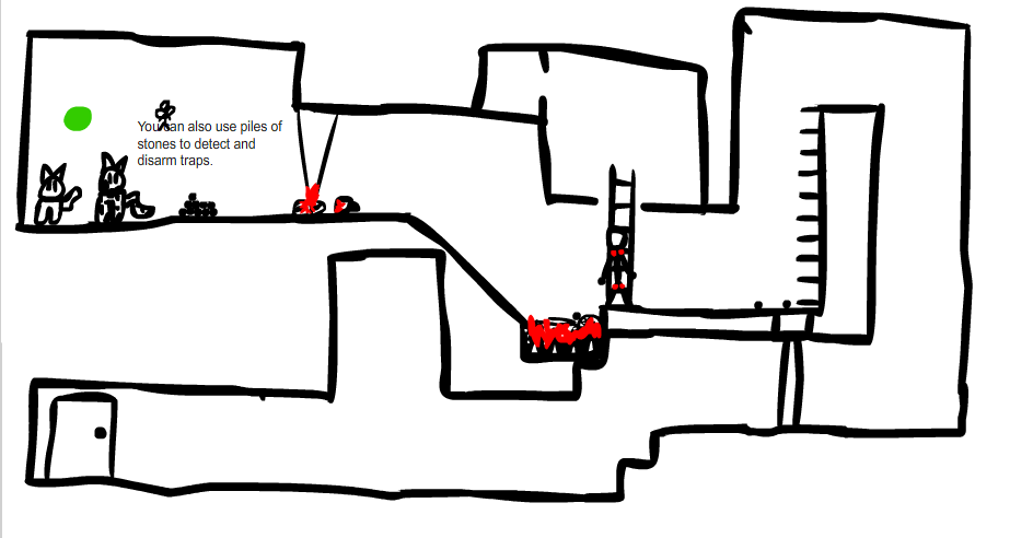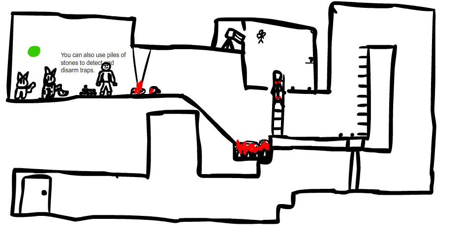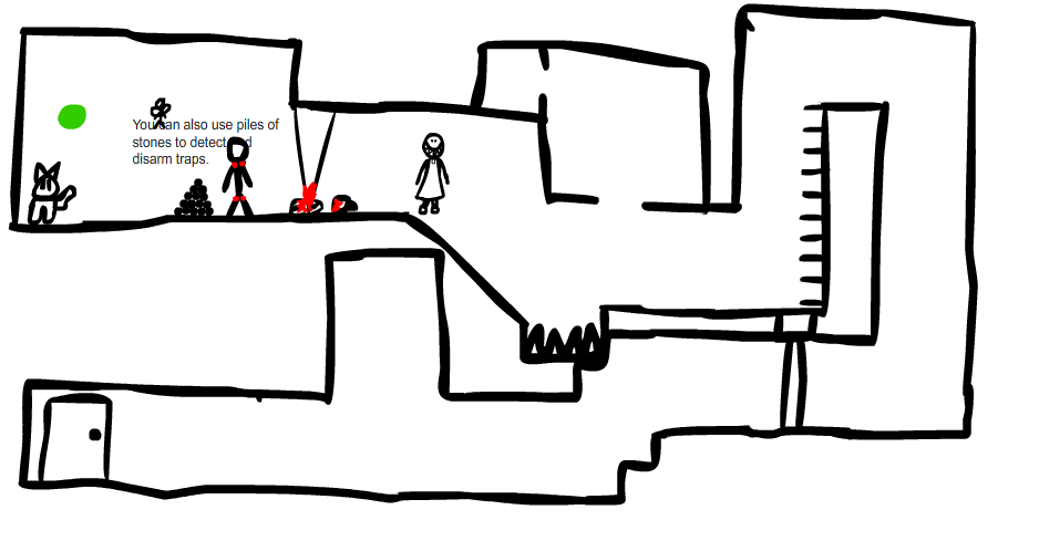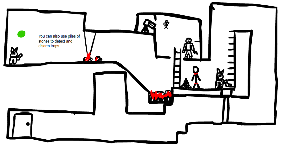 Climb up ladder slowly and roll rock along surface to left. Slide down ladder immediately. If nothing happens, climb back up and retrieve rock. Stand on X, making sure to stay below laser sight lines. Then lean back and lazily throw one rock straight up and immediately throw the other one along the dotted red line, as hard as possible.