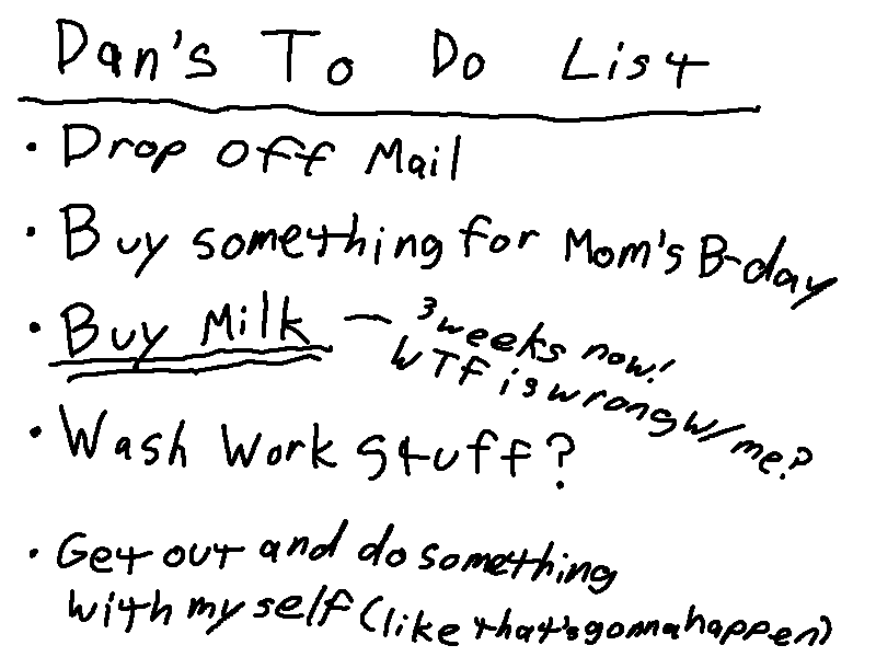 As Dan continues his usual day-off morning routine, he mentally constructs a to-do list of things he's got to get done today. It amounts to roughly the same stuff as last week.