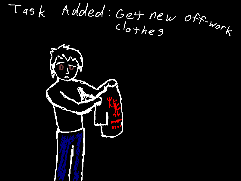 However, getting a new set of off-work clothes seems like good idea, as he finds his UUterglashtikobven world tour shirt. Geez... that was ages ago. Before the scandal about UUterglashtikobven not even actually being foreign at all. After that... they just weren't the same band. Unfortunately, it's the only somewhat decently clean shirt he's got at the moment.