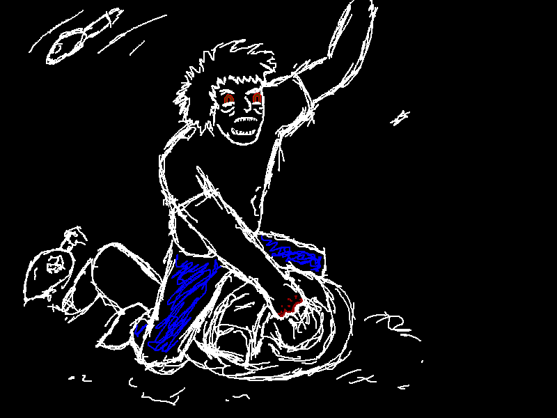 What... just happenned? Dan doesn't remember. His hands... more specifically, his knuckles... are bleeding. He's beating and ripping at whatever that thing was, electronic components scattered around him. A few of its limbs aren't on it anymore. The already wrecked store is a bit more wrecked.