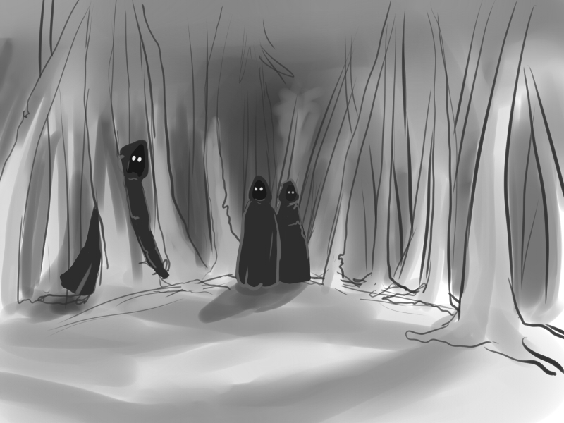 They led me farther from the trade road than I ever would have willingly ventured. It was a mystery how they were able to keep their bearings. These woods may as well be endless. What could anyone be hiding from? Privacy is a boundless commodity, perhaps, but their shifting eyes and intent gaits further puzzled me.