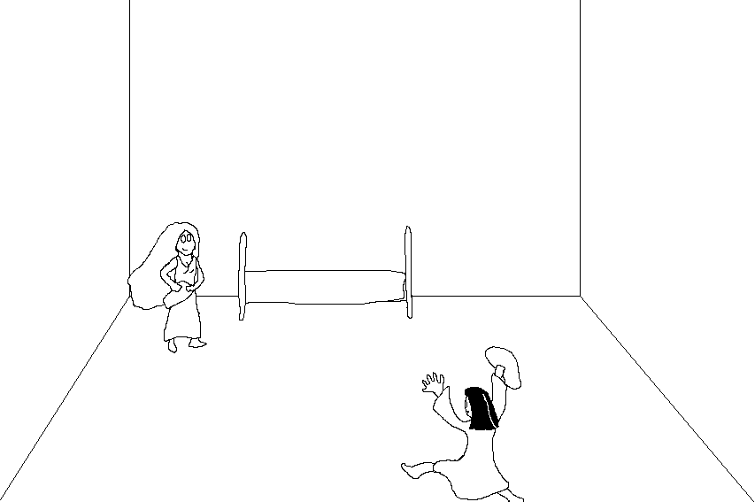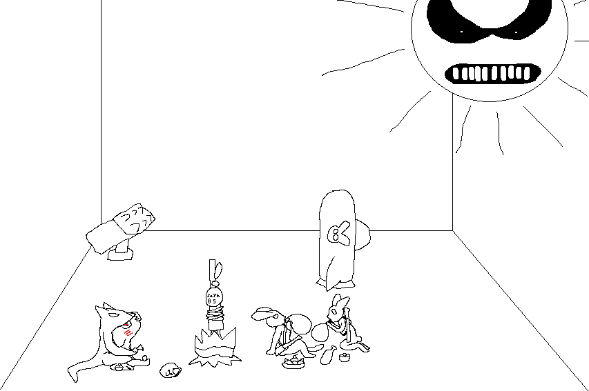 However, a large hen does appear in the room. A sergal and kobold appear in the room as well. The hen is quickly taken down by the sergal. A fire appears. The hen is cooked and shared among the kobold and the sergal. The Sergal and Kobold are friends.