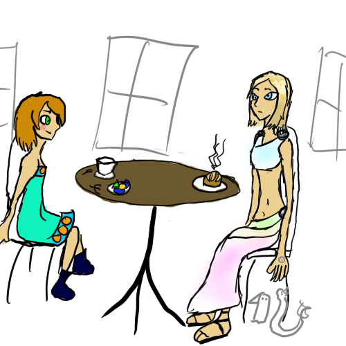 I try making motions to communicate, and I think Siisa picks up on it because she takes me to a strange-smelling building, where we sit at a [table] and she babbles something to a person taking notes. After a while, the note-person comes back and puts down a bowl of mushy things and some brightly colored foods (I know they're fruits of some kind, but I'm not sure of the [Skivvish] words) by Siisa and something light brown and smoking hot by me. Siisa starts eating, and after having her taste some of mine to make sure it's not poison or anything, I try eating the food. It tastes weird, but it makes my stomach stop hurting.