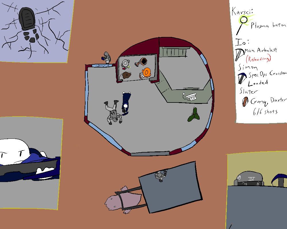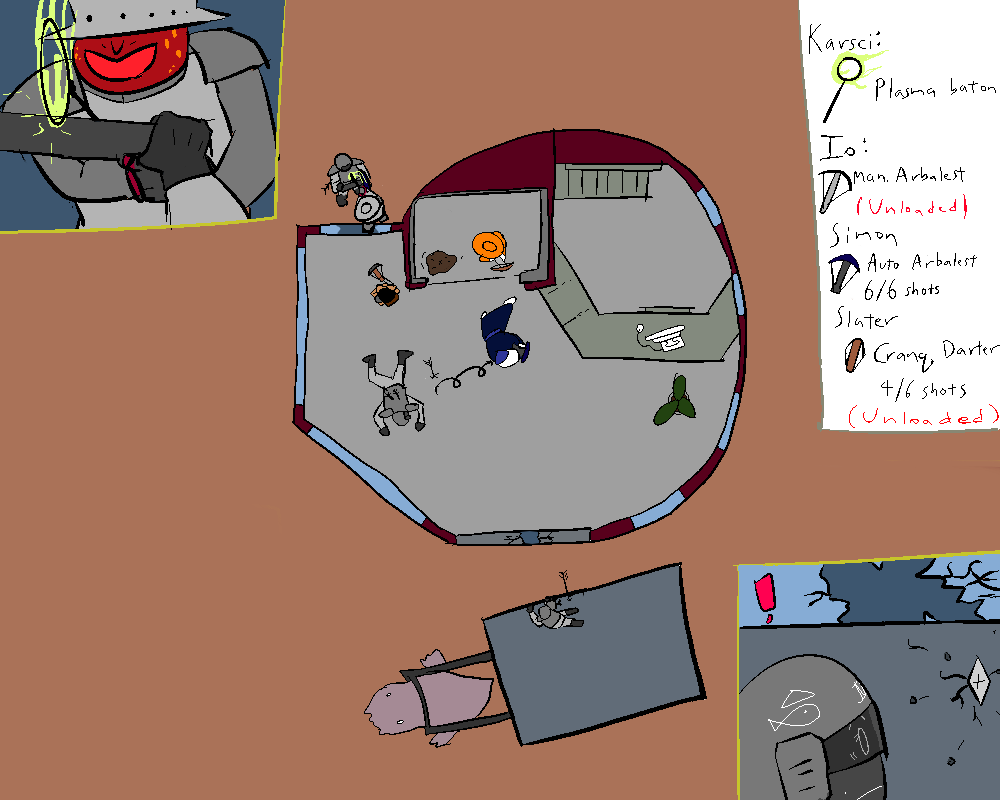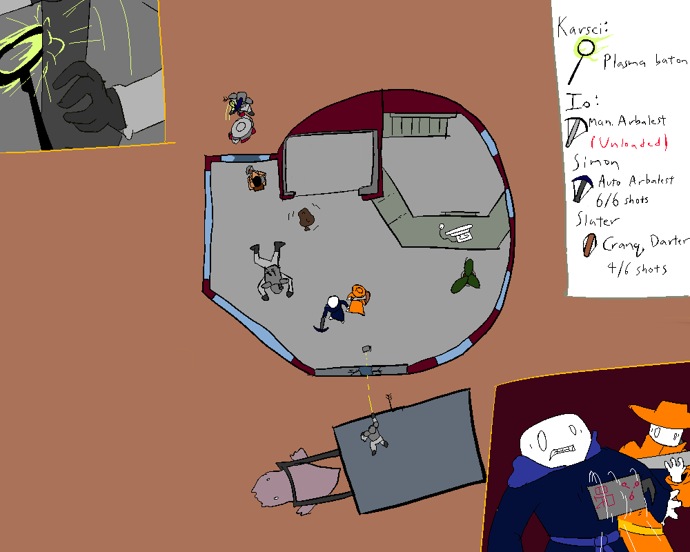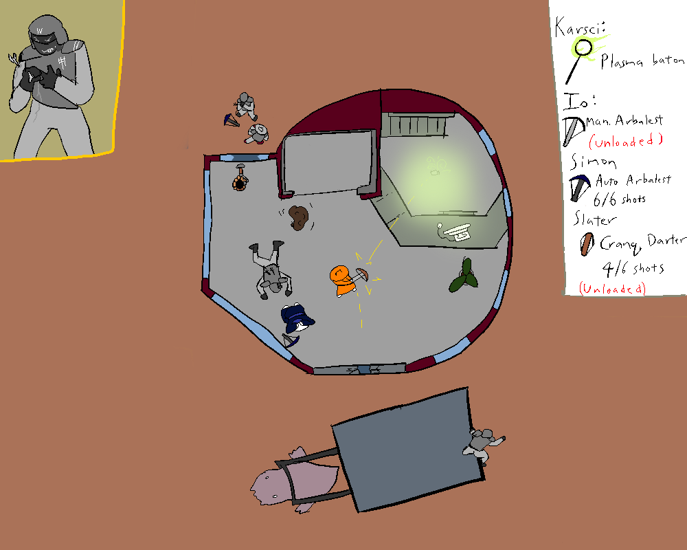 While the agent is still reeling, Karsci charges around the corner and assails him with his plasma baton. The agent reflexively guards the strike with his crossbow, but grunts in pain from his wound.