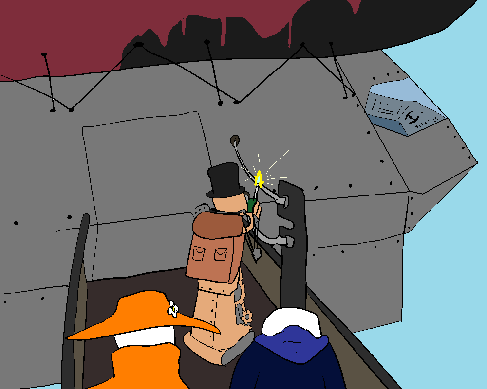 Io considers just punching the throttle and flying the airship right off, despite the damage. It looks like the steering wheel is mostly undamaged anyways. Should she risk it?