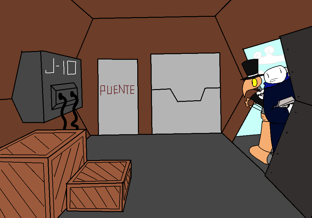 The agent in the wagon draws a darter and peeks her head above the sides. The glass sliding door in the front of the building is still closed.