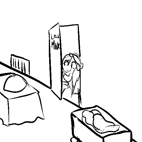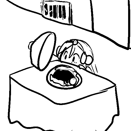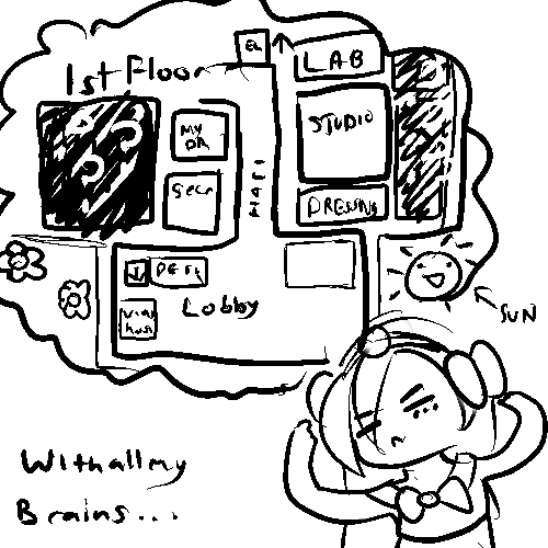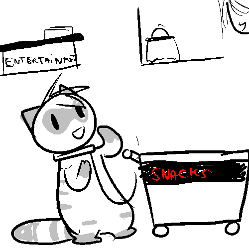 Pen makes it to the lobby, as everyone is out to lunch, so the hallways was clear. Oh look, Vinny is working. Making polite talk and selling the food from her cart! Turns out, Vinny's job is that of a food vendor for the building.