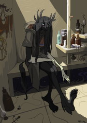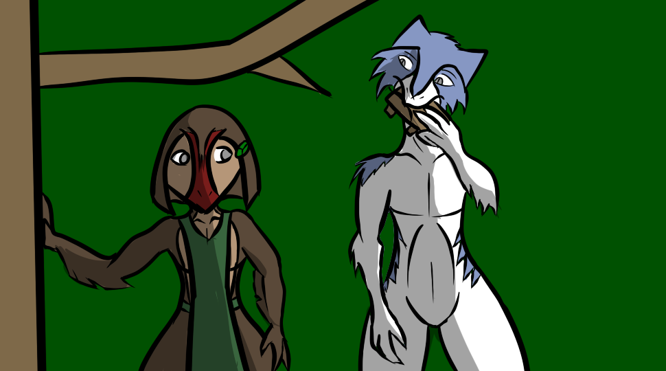 It's been a day since I woke up and nearly flipped out in the Talyxian's arms. That first one was scary and had crazy eyes, the one below is still scary but she's at least sort of almost friendly. We stopped to rest and now Jingles is saying we should stop here for the night, or at least that's what Tienaye says he says, he isn't trying to speak to me directly anymore after what happened last time. Me and Ikar were just up in the trees to try to get a better look at some smoke in the distance and it looks like a lot, way more smoke than fires that a group of merchants or a scouting group would make.