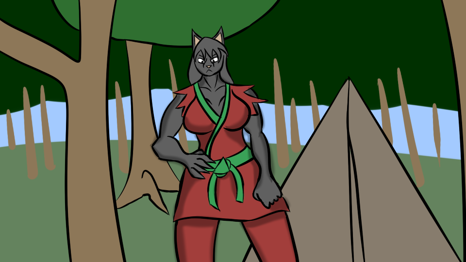 Tienaye says "He says hello." in an irritated way from where she's fussing with the tent stuff.