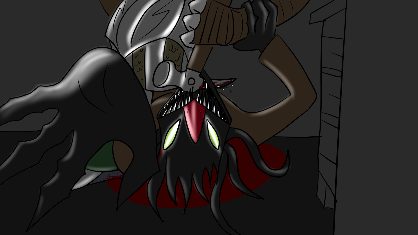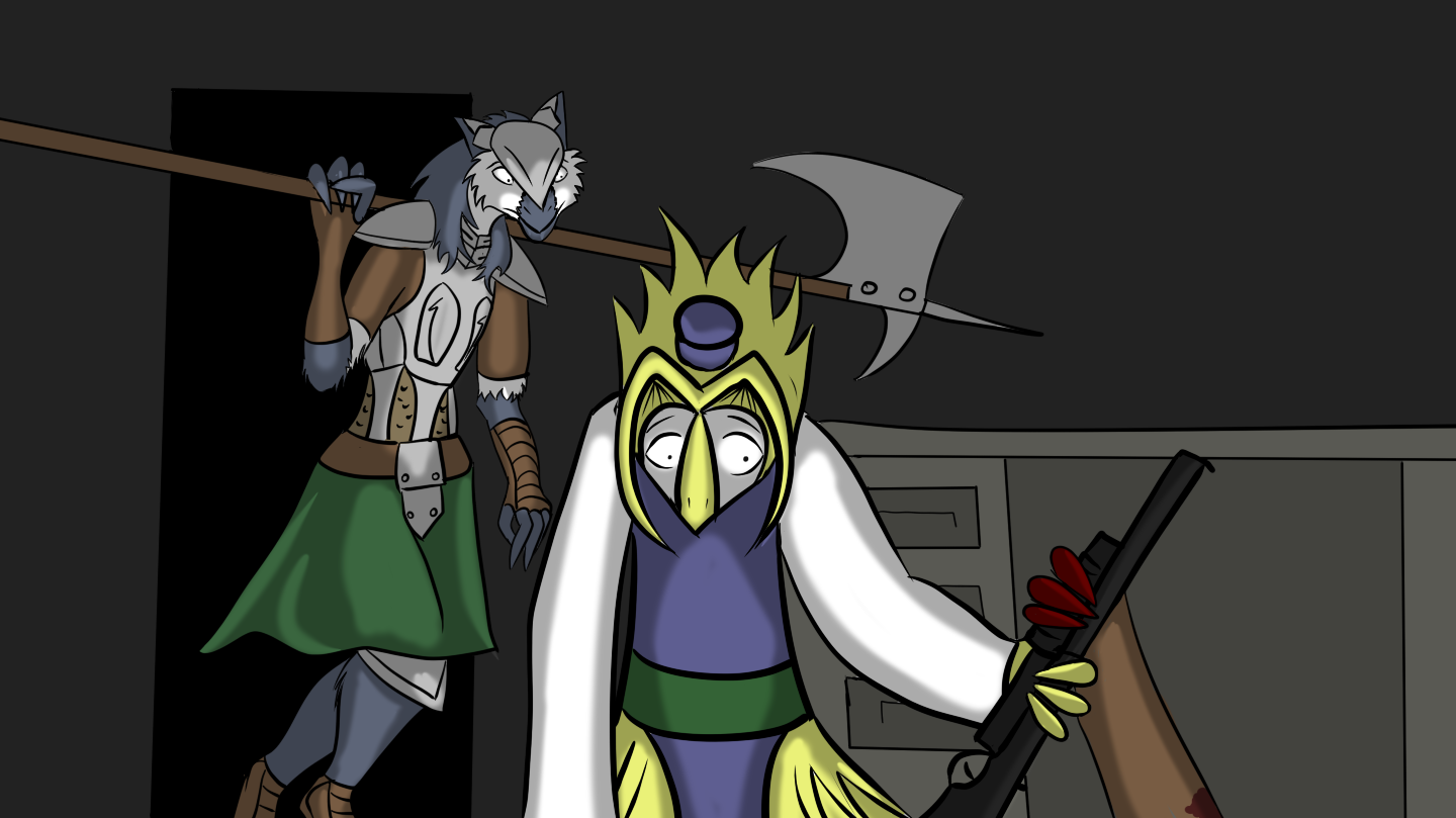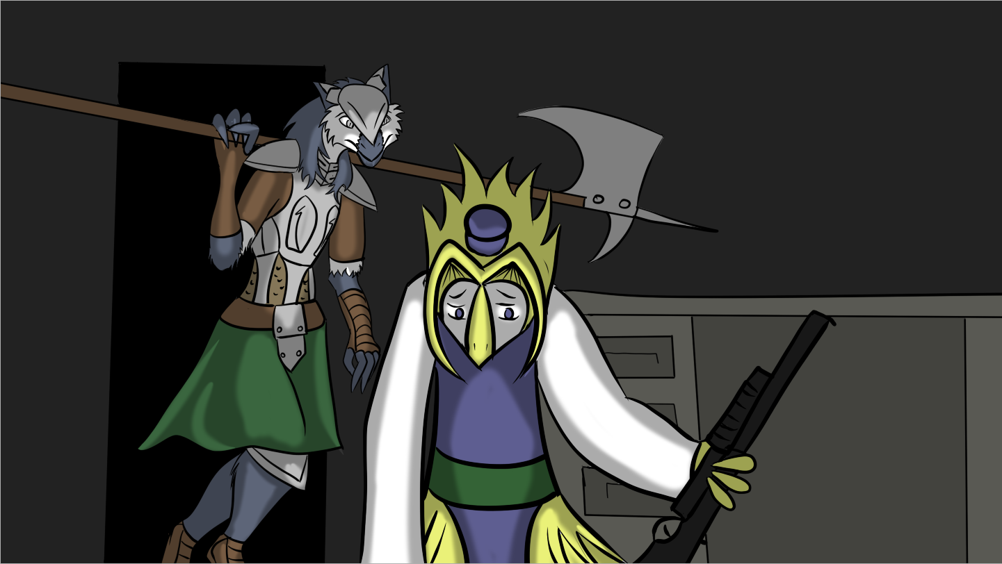 Aruuchi takes off to the other side of the room faster than I've ever seen him run before, the Talyxian yells something and then shoulders his rifle, taking aim at my friend and firing. Before he can take off a second shot I've already fired two at him, I think I got him with both shots but I can't tell, it's too dark to really see, either way he starts screaming... and as time seems to slow down I think I can see another figure coming through the doorway...