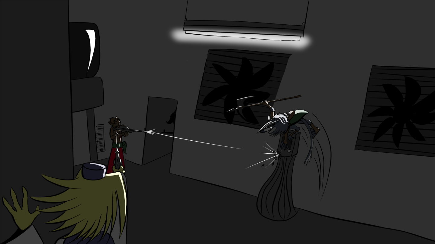 "HAHA! Nice shot!" Aruuchi yells. It echoes through the chamber.