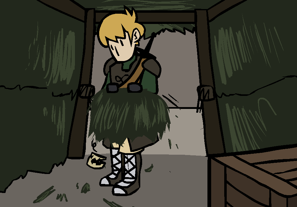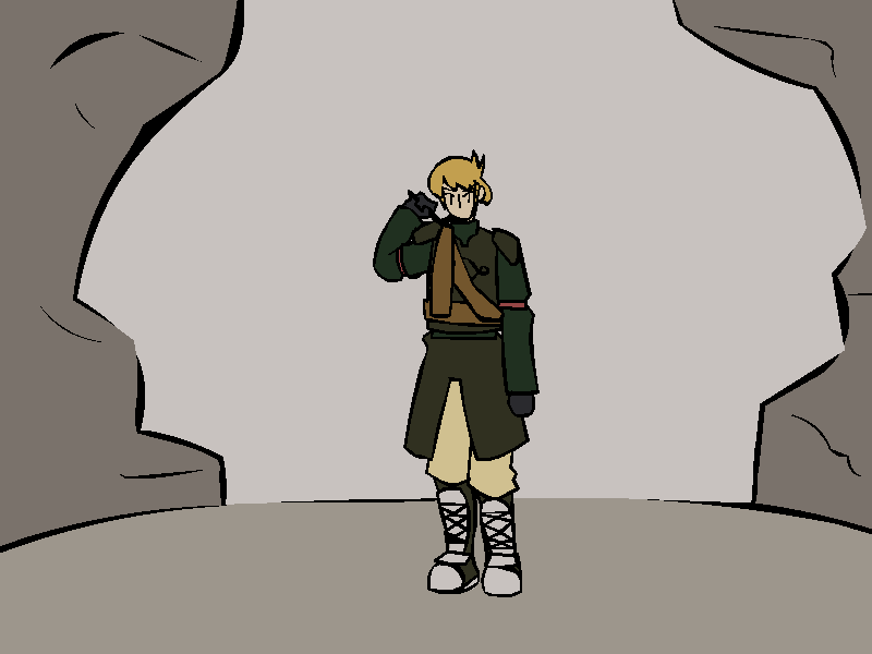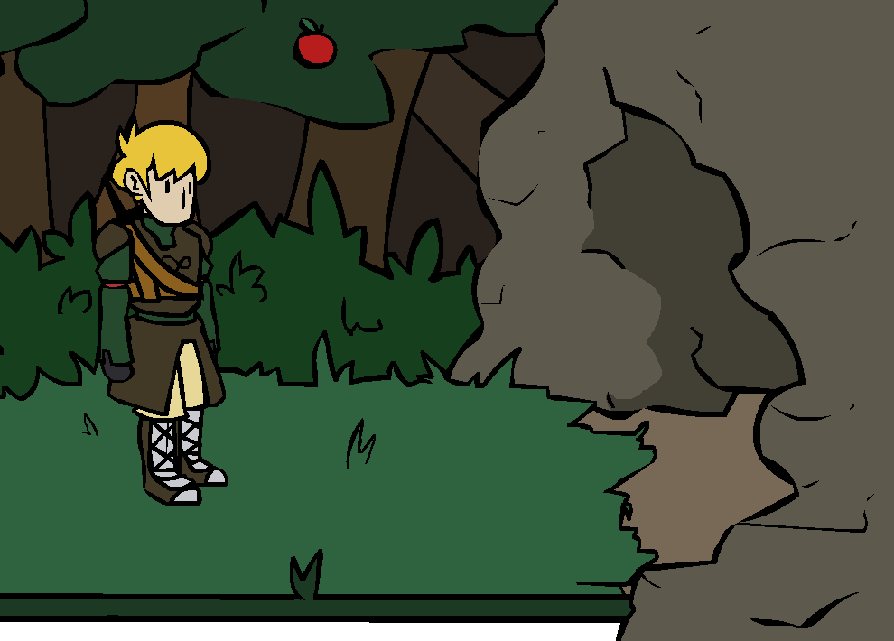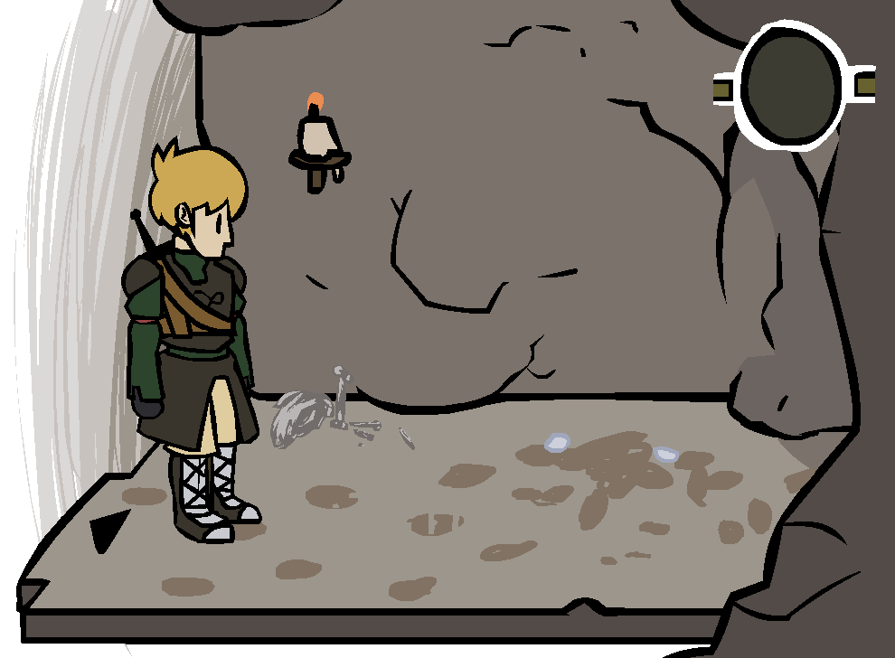 But that's enough pointless and vague backstory. Allan currently finds himself at a clearing in the woods, the dirt trail beneath his feet surrendering to the surrounding grass. A massive cliff face stands before him with an opening no taller than himself facing outward. The musty smell of sweat and dirt practically forms an aura around it. Allan figures this is the place...