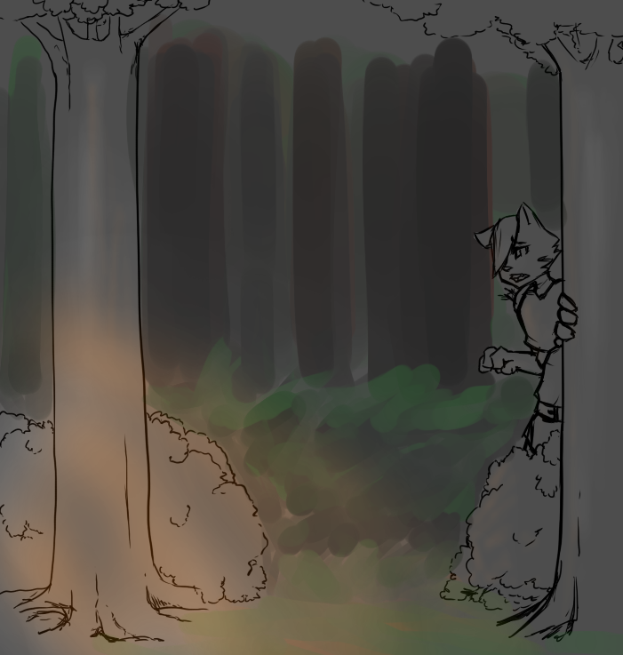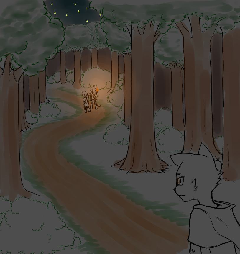 The two catfolk walk off down the path nearest to them, presumably towards the aforementioned village that they were talking about. The light from their torch grows fainter by the second as the pair get farther away.