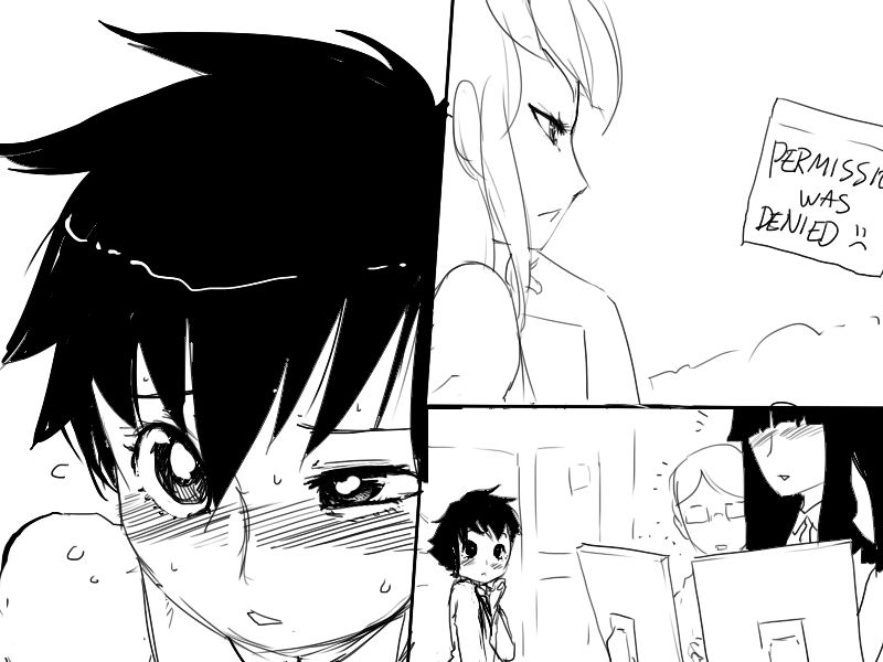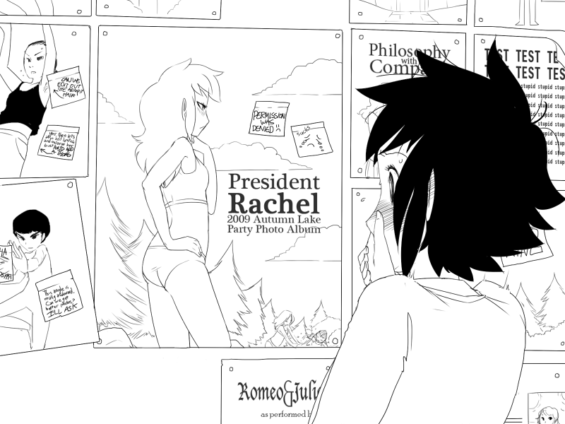 The Rachel one says- Ah! That swimsuit is really revealing! Uhm!! It- Yes, the post its! Uhm! Uh! It says 'Permission was denied' with a sad face, and then 'sucks' with a crying face.