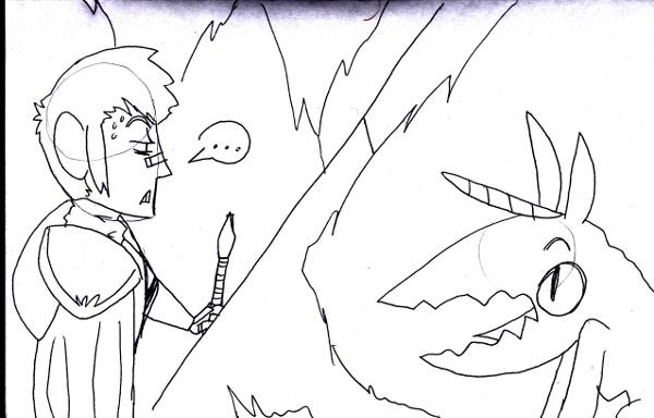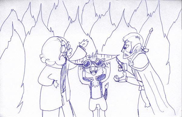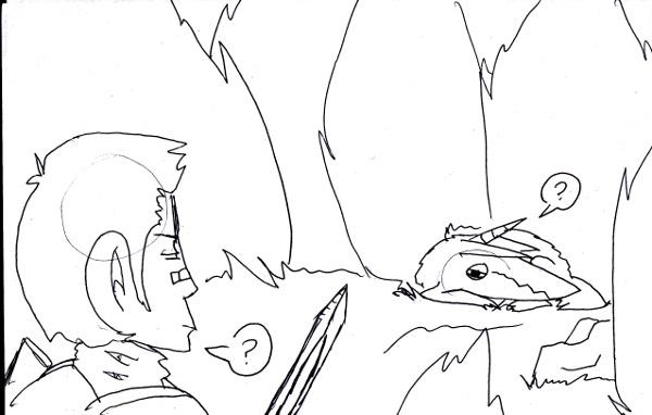 "WELL IT ALL STARTED WHEN WE WERE KICKED OFF THE AIRSHIP WHILE STILL AIRBORN, THEN WE FELL INTO THE FOREST OVER THERE WHERE THE YEW TREES SAVED OUT LIVES. THEN THERE WERE THINGS THAT WERE CRAZY LOOKING! Kinda like wolves, but they seemed demon possessed- had no hair, and had one tiny little horn atop their heads. PLEASE COME QUICKLY, HE NEEDS OUR HELP!!"