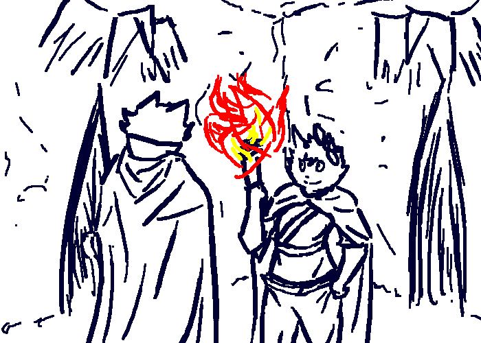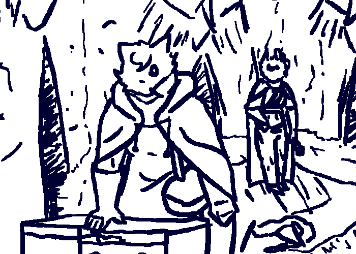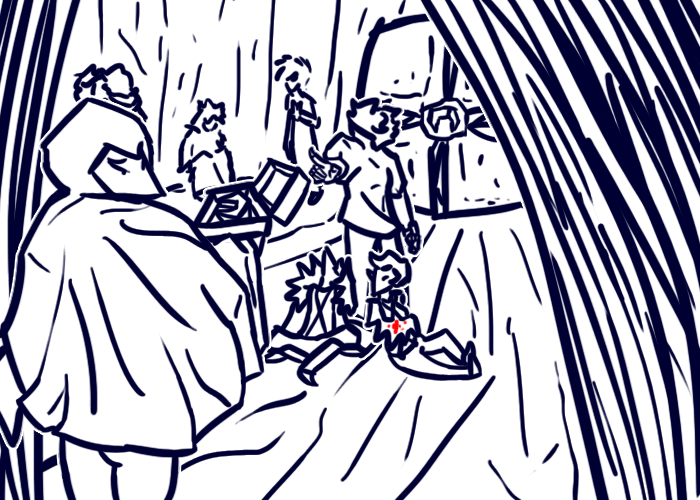 "Tyfon, don't be a child," a member of the group, standing to the side, calmly interjects. The avian wears a fastened cloak. The supposed leader turns away from the fuming sangsaloj to face his insubordinate subordinate.