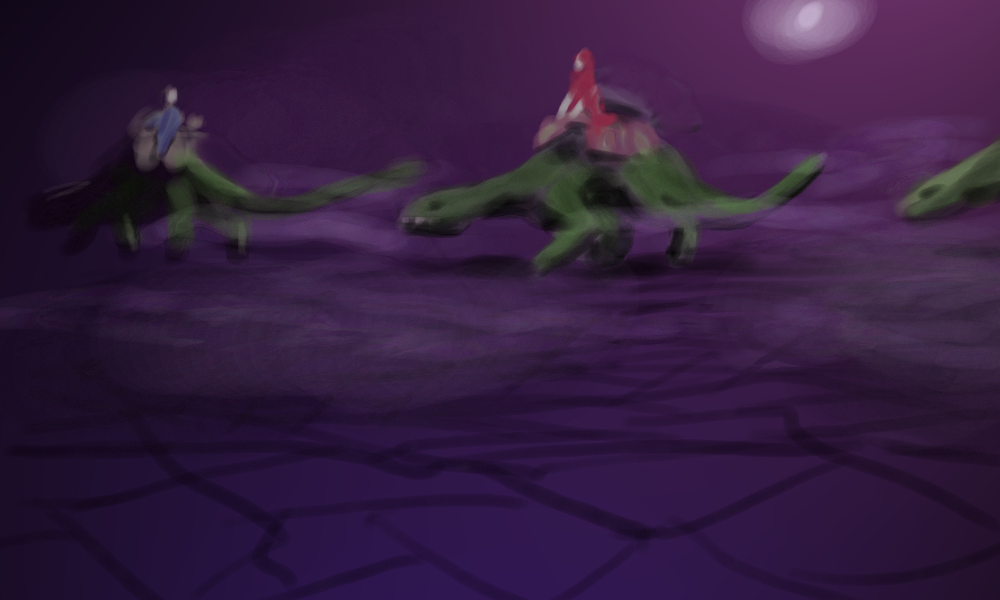 The caravan leader rides next to us and shows the way to the Chills portal and urges us to not get lost in this oblivion. The next thing we see are the large lizard beasts of burden toddle to a destination still unknown to us. It's still a half days trip to the Chills portal Runyc councels us. Enough to have to fight our way through living obstacles.