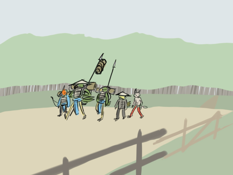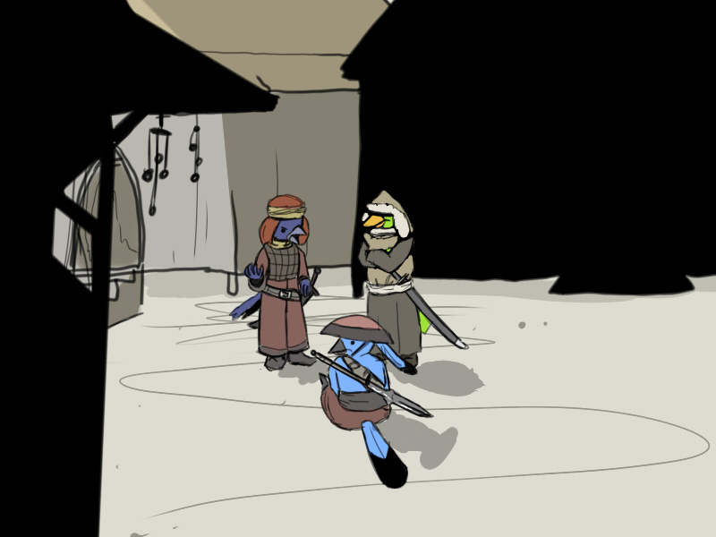 Irol tells everyone else to come with him. They quietly move toward the voices that they hear, which are coming from deeper in the village. As they close in...