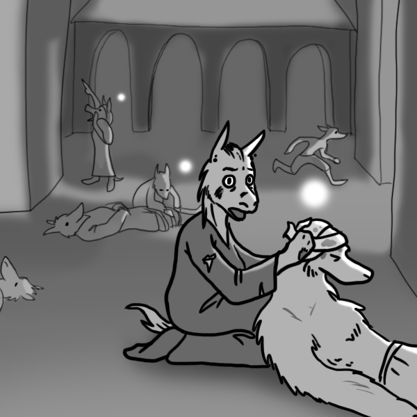 Once the decision is made, the apprentices quickly gather a lightweight selection of tools, weapons, and other supplies, such as food and rope. Having no need of any of these things, I simply wait.