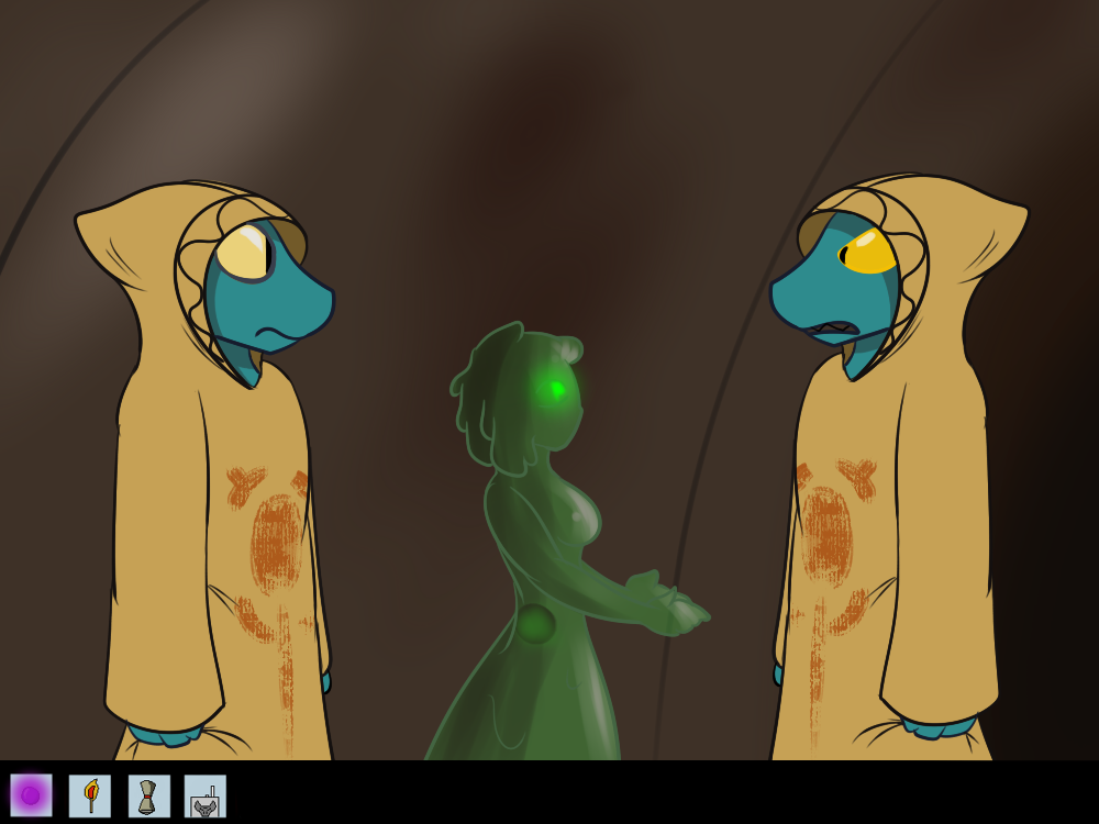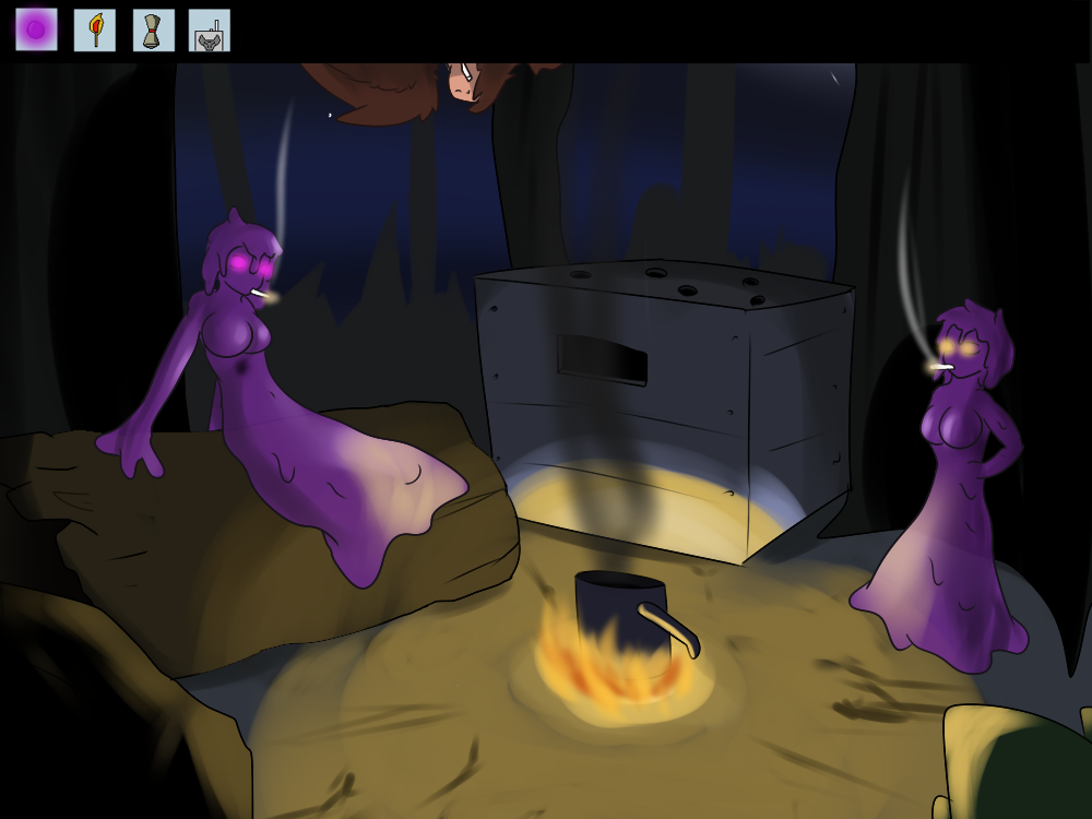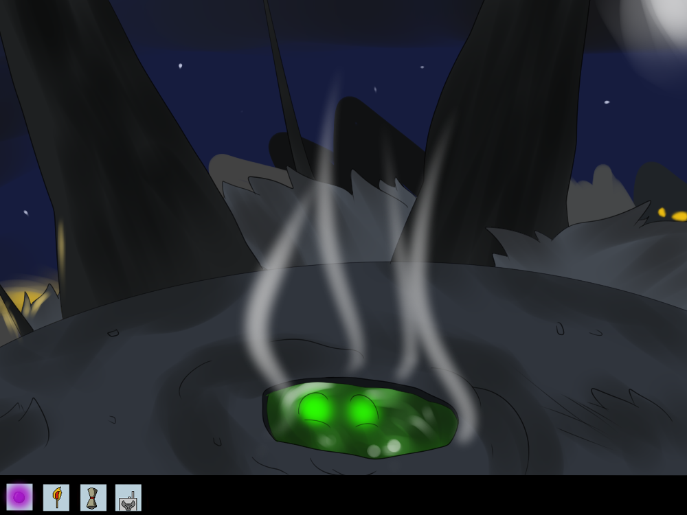 She finds out the source of light soon enough. A campfire, just to the side of the road, with a pot slowly heating up some liquid of acrid smell. Sitting around it, a couple of creatures Mechi hasn’t ever seen before, one of them small and scrawny, with green skin, wearing a suit that has seen better days. The other one couldn’t look different: tall and muscular, skin covered in short fur, and a more animalistic head and manners. Unlike the short one, he’s almost naked, only wearing straps adorned with feathers and small bones. The two of them seem to be dozing off, only awakened by the soft sound of struggle inside of a box next to them. Sometimes the big one kicks the box and growls something like “Be quiet. You’re not getting out.” before dozing off again.