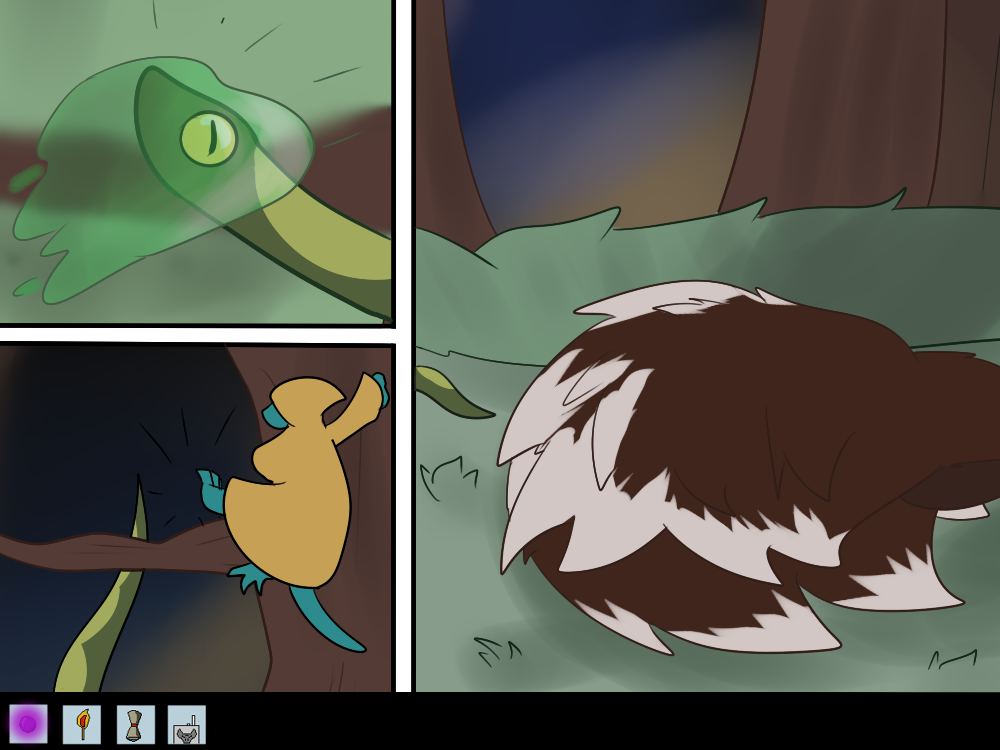 After a few minutes going through the forest, the sun rays peek through the ceiling of leaves above, warming up the jelly mass that is Mechi’s body, making her feel pretty content, despites the misadventures of the past few days. Mirla seems to feel better as well, and soon she flies over the trees to scout around and stretch out her wings freely.