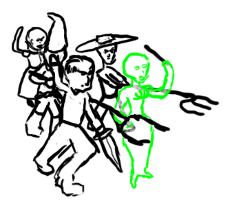 Hans, being the one with the sword, the eyepatch, and the assumed experience, assumes the position of leader and proposes that the jelly golem go in first, followed closely by himself, to clear a safe area for the pitchforks to rank up behind. The others do not object.