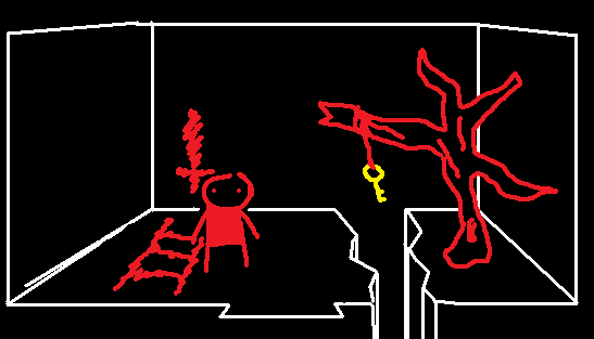 This seems strange to you. The scribble man on the wall is gone, along with the cat face. But that is not the most interesting thing in the room, it seems the doodle on the floor is now replaced with a large gap and the tree that was on the wall... well it's now real, along with the key you drew on it. What do you do next?