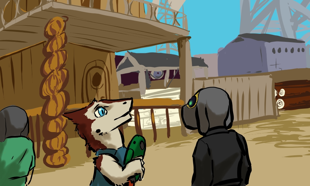 Turns out the wood place is near the stables, so I make some conversation on the way back. The Snakes are a group of raiders based out of an old refinery that they've turned into a fortress of sorts. They steal food and weapons, mostly, and take goblin slaves if they can. Their leader is a gnoll named Finder, and they mostly are sergals and gnolls. They've got a bunch of scavenged vehicles and weapons left over from when the army occupied the area.