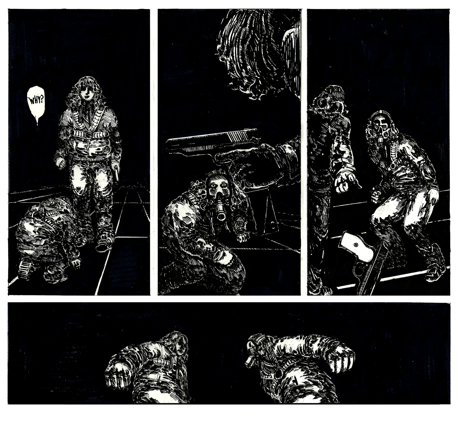 She does not respond. Her only moves are that of her left hand. With a single click, she unloads the pistol's magazine, moving it to her right hand before discarding it, the magazine falling down to the ground making a clutching sound.