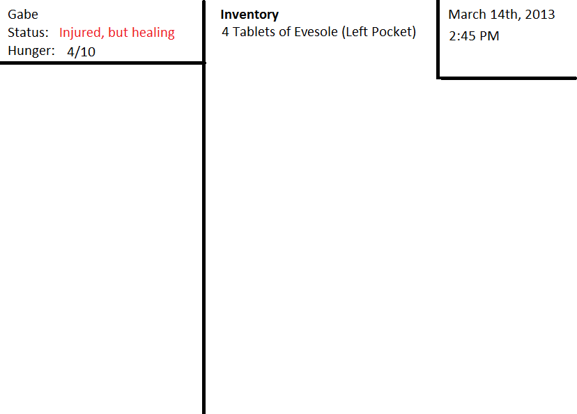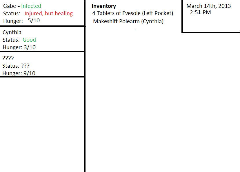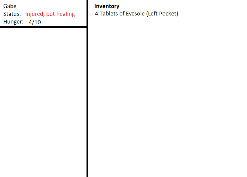 “Yea, most of the bottle actually,” she replies, pulling the medkit out of her backpack and drawing out the requested bottle. “Here.” Gabe takes the sterilizing agent and pours a little into his hand, wiping down the edge of the box cutter as well as he can without cutting himself.