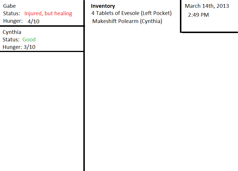 “So anyways,” Cynthia eventually says, trying to change the somber mood, “What do we do now that all of us have had at least something to eat?”
