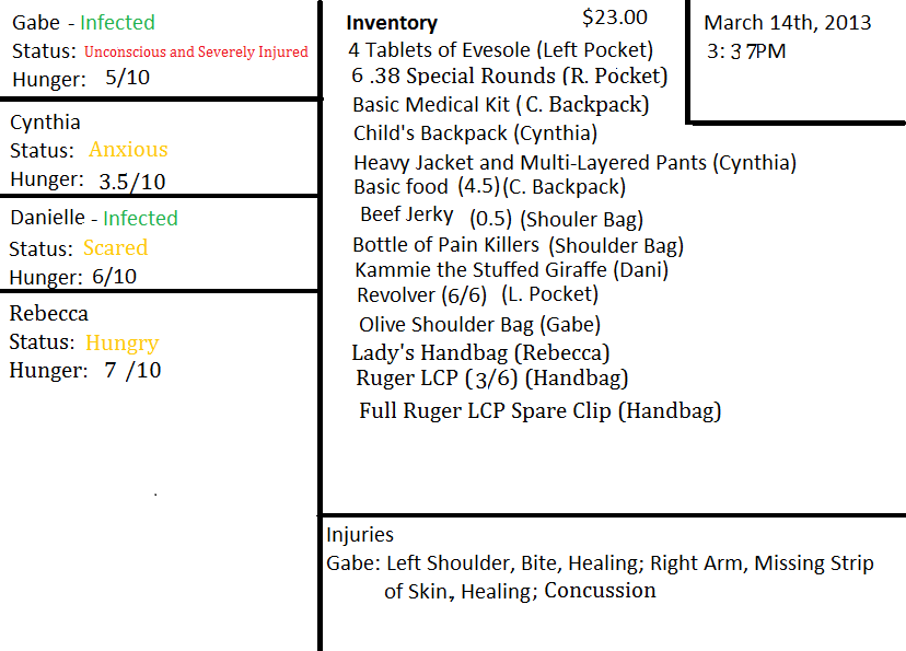 “I'll bring you something here right quick,” he says to assuage her desire. “Cynthia, would you go fetch me a Frisbee or something?” She nods and hurries off back into the store, while Rebecca finishes coaxing Dani out. The little one's eyes never leave the pair of corpses.