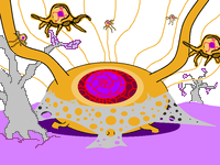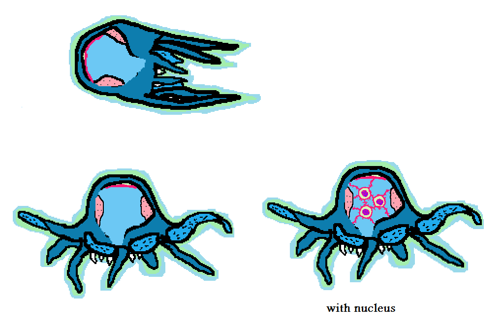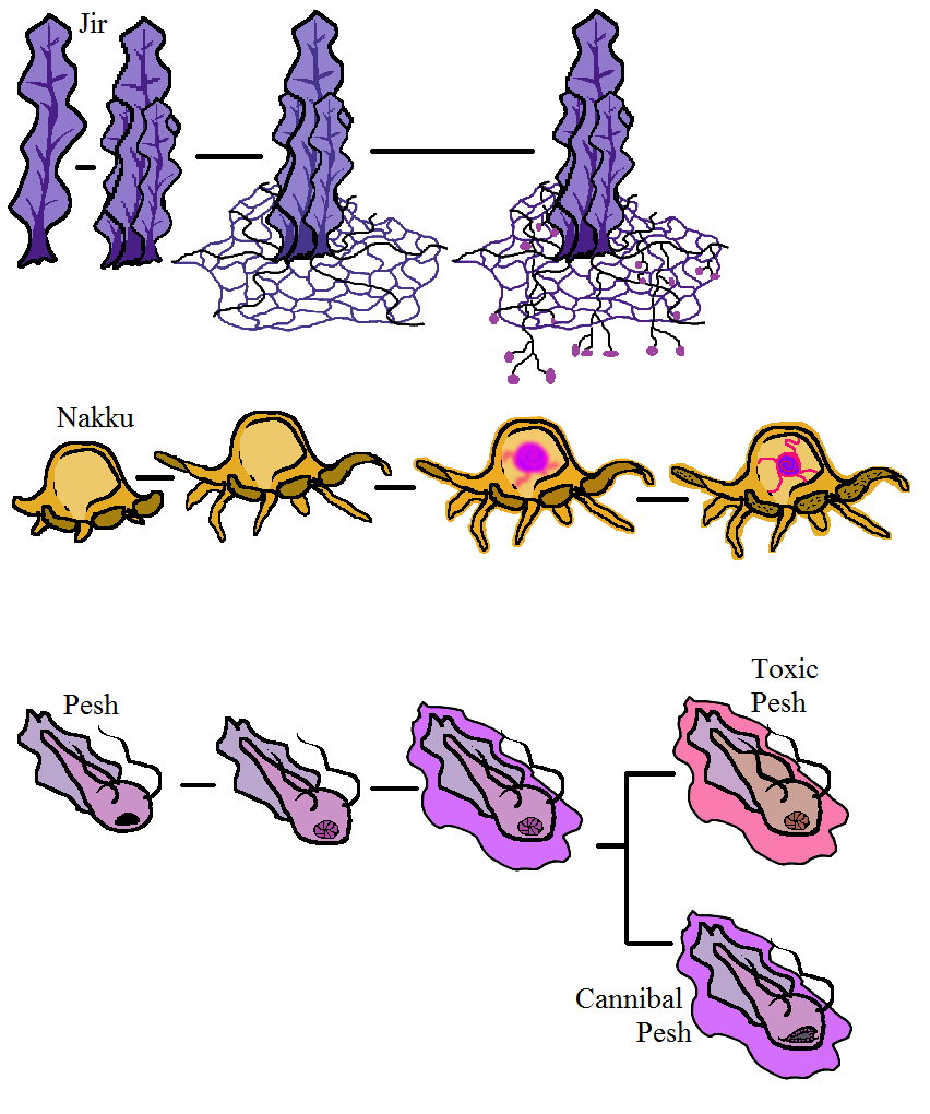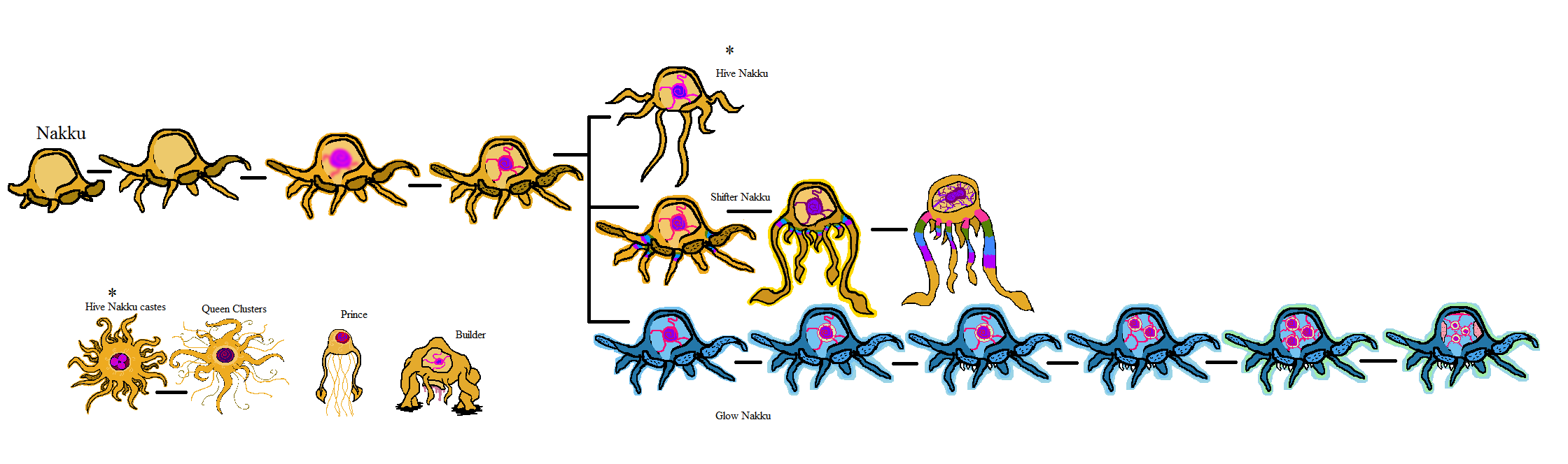 The Nakku develop a basic nucleus. This combined with a simple nervous structure were originally developed as the Nakku required more control over its lengthening appendages. A side effect of this development has been that Nakku seem to be able to transmit information through their thin, jelly-like membrane, even to other Nakku. Nakku are often seen in clumps or small floating colonies. With relatively increased intelligence these colonies prove to be formidable predators despite their limited mobility.