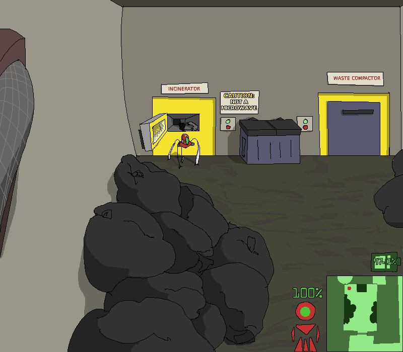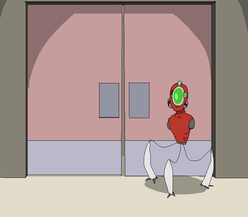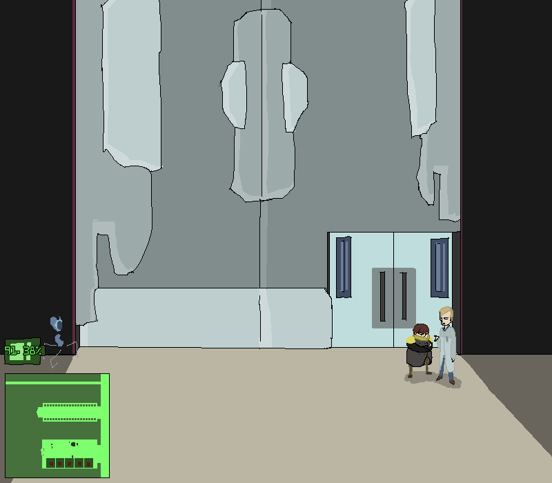 You gradually clamber along the ceiling fixtures, making your way to the end of the hallway and surveying the surroundings. Far ahead of you in the distance, the last of a few vehicles of... some kind... are disappearing up a massive metallic ramp. Armored and uniformed bodies flit between and behind them, and through the various doors and hallways that you can see open up to this larger corridor.