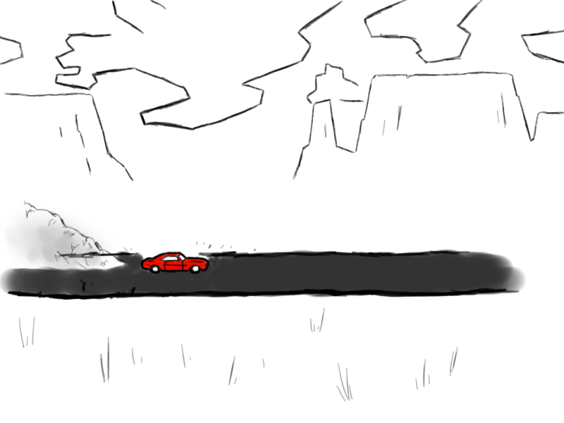 After about two hours of driving, a small speck appears in the mirror and begins growing larger. Hazel gets visibly tense, gripping the wheel tight.