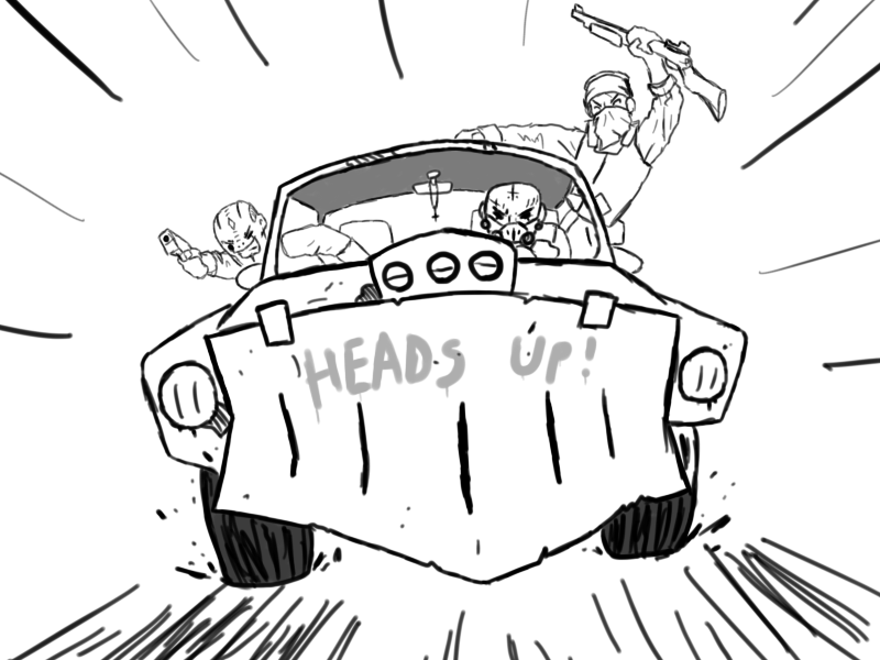 Bathroom? Check. Snacks? Check. Grenades? Well... it turns out the only place to get them was fresh out. With all of the boring preparations taken care of, you finally pile in the car and take off. You called shotgun. They snoozed, they lose...d