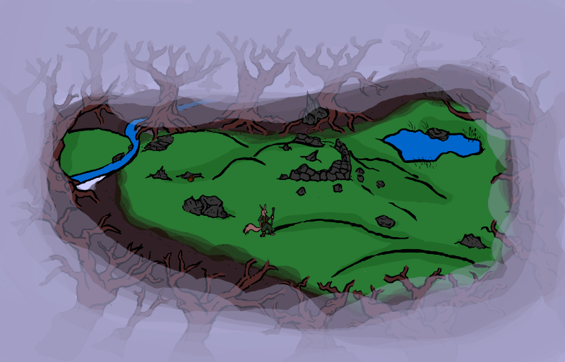 Taking a little while to examine the clearing, a couple of useful points are found. Most importantly near the center is what appears to be the nexus of the fount, a rough rock formation sticking out from the crest of a hill. Also, there is a pond in which you strongly suspect are a fair number of fish that you could catch.