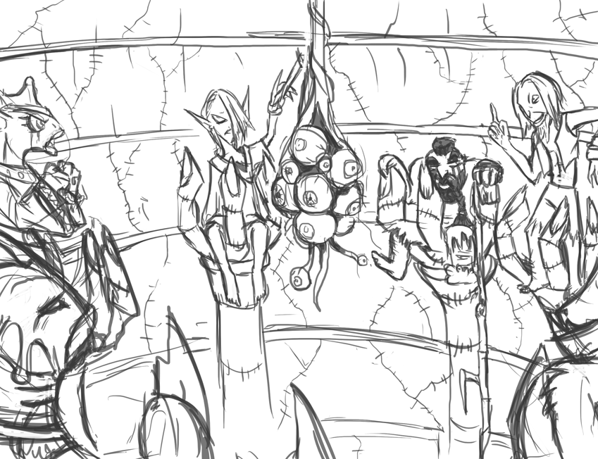 there's a weird light source dangling in the middle, there are six other creatures in the room.