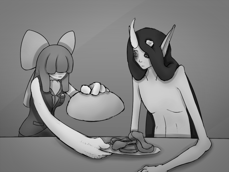Something clanks against the table. You glance up to see a servant placing a plate of food before Senharf. It's... a pile of raw meat. Raw meat that you cannot identify as belonging to any animal you know about. Wonderful.