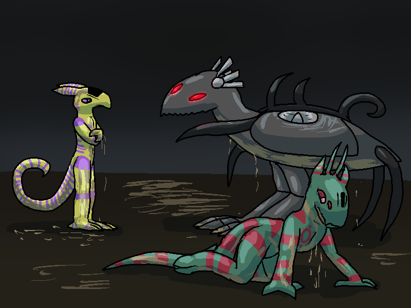 Roc examines his wing again, covered in dirt and mud all over his front. He stares at SB-40423, who does not break eye contact.